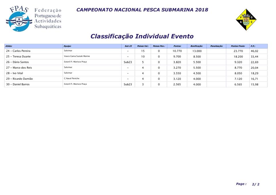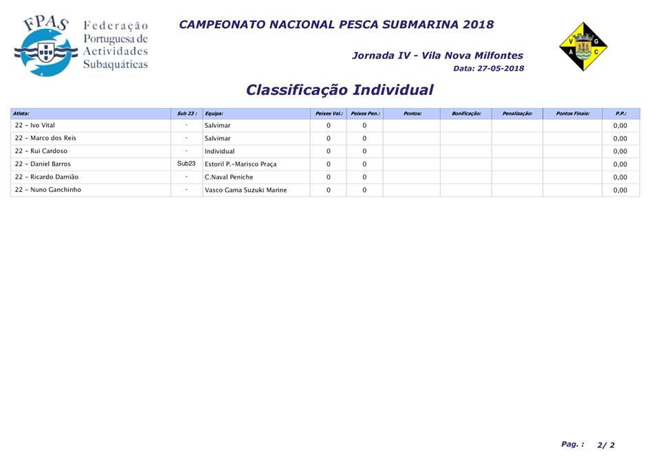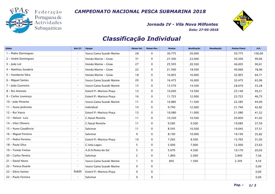 Tabela classificativa Individual da 4ª Jornada do Campeonato Nacional de Pesca Submarina 2018: