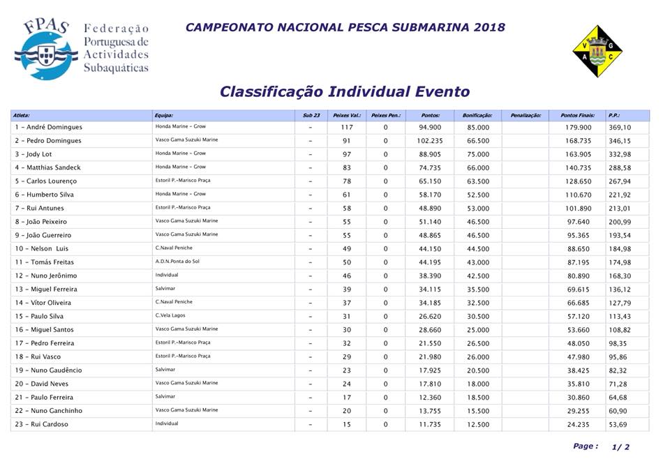 Tabela classificativa Individual Geral do Campeonato Nacional de Pesca Submarina 2018: