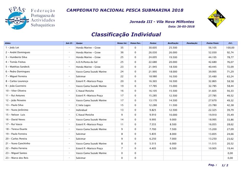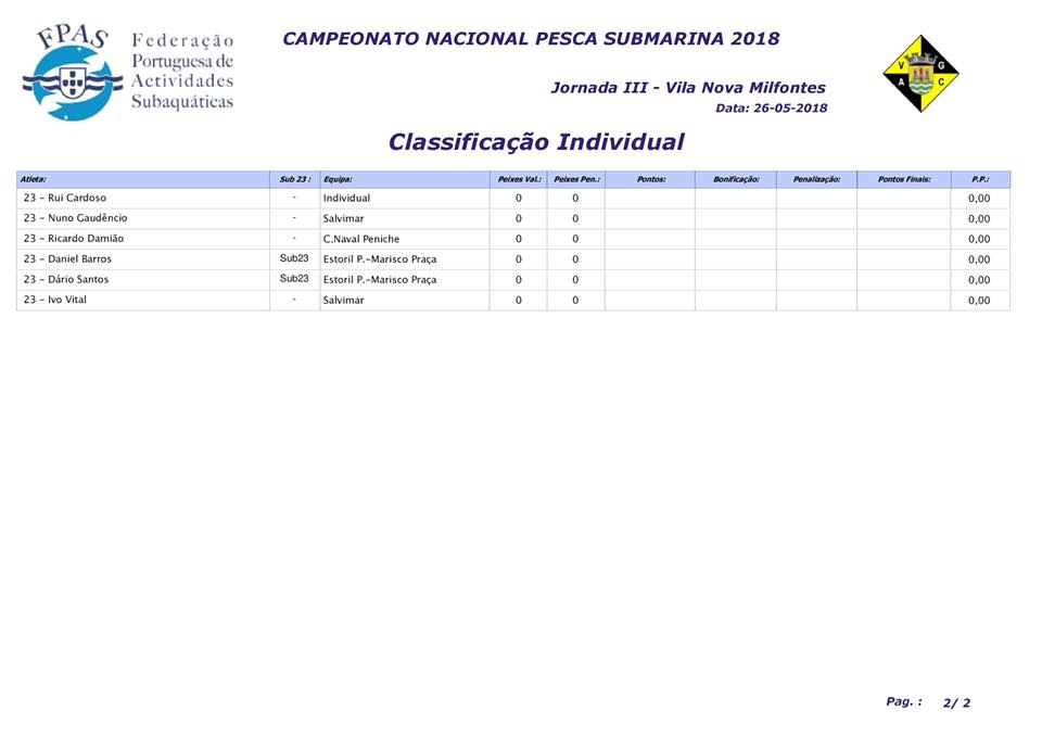 Tabela classificativa Individual da 3ª Jornada do Campeonato Nacional de Pesca Submarina 2018: