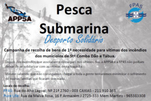 Na sequência dos trágicos incêndios que voltaram a assolar o país nos últimos dias e que provocaram, mais uma vez, vítimas mortais e muitos desalojados, a Associação Portuguesa de Pesca Submarina e Apneia (APPSA) e a Federação Portuguesa de Actividades Subaquáticas (FPAS) uniram-se e estão a promover uma campanha de recolha de bens para as vítimas dos incêndios dos municípios de Santa Comba Dão e Tábua.